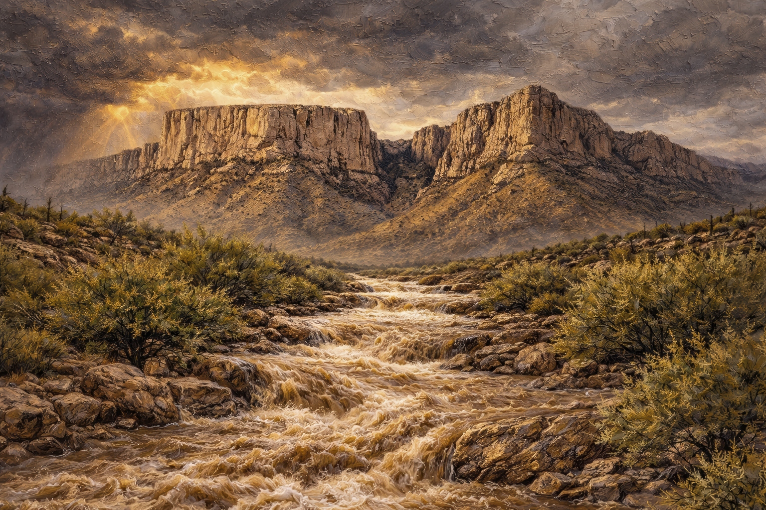 The piece now titled “When the Desert Drinks” began as an attempt to paint that ridge behind a monsoon flash flood rushing through a desert wash. It went through more iterations than any other piece in the Sonoran Art catalog. The team sat down to talk through what happened — honestly.