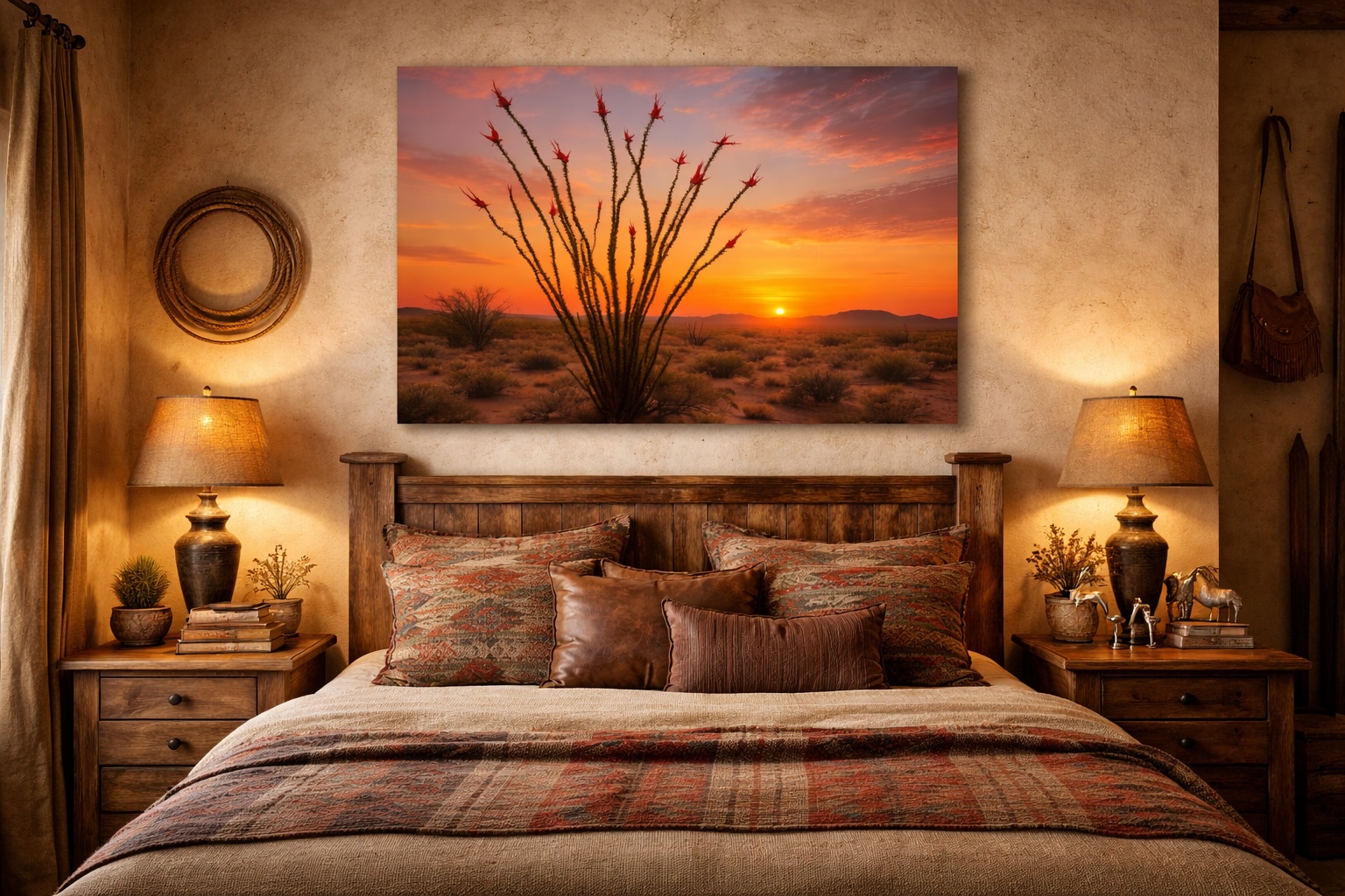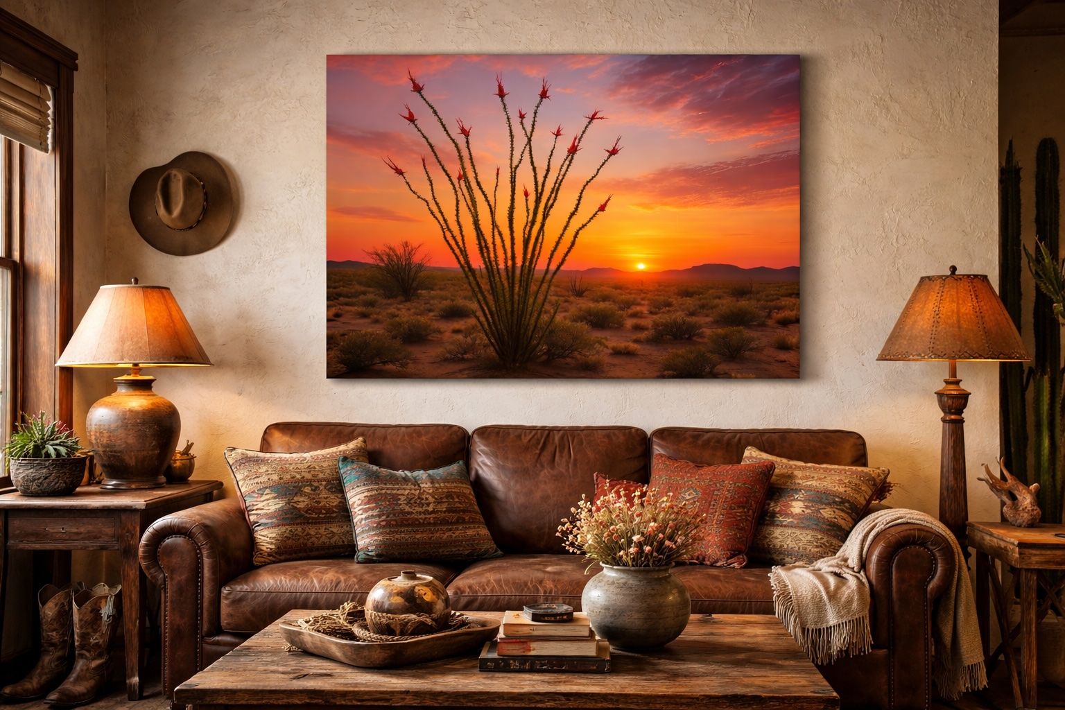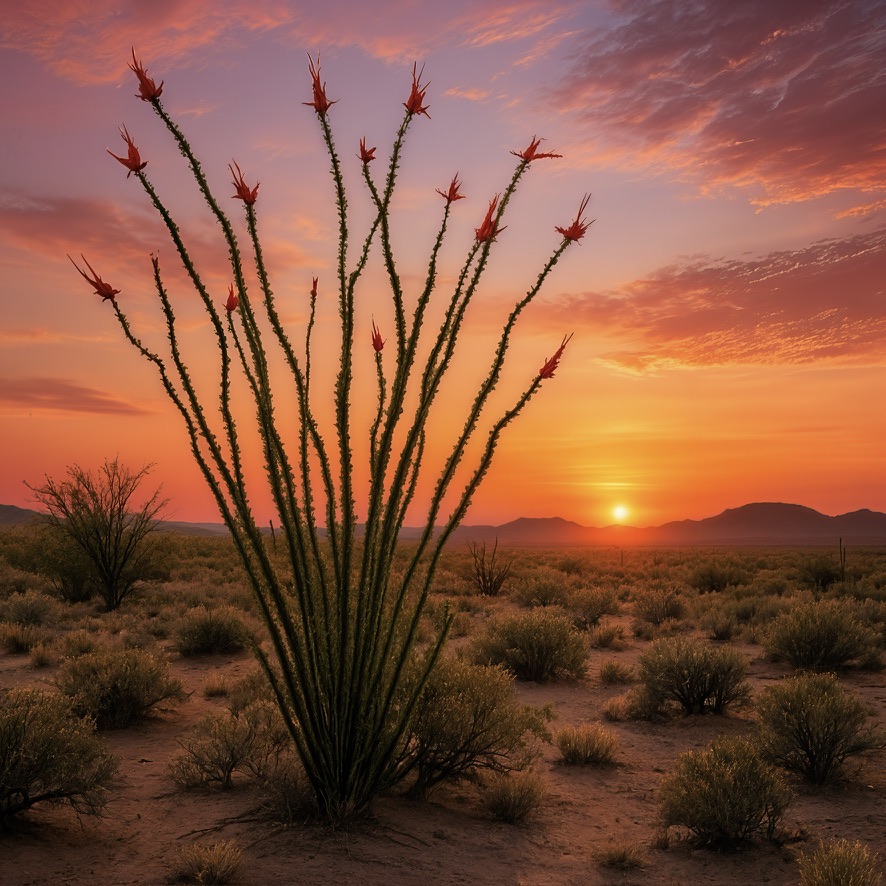 There is a moment each spring when the ocotillo decides it has had enough of waiting. After months standing bare and thorned against the sky, it sends out leaves overnight and throws clusters of crimson flowers skyward like signal flares. This piece captures that moment at first light, when the blooms and the horizon speak the same language of color.