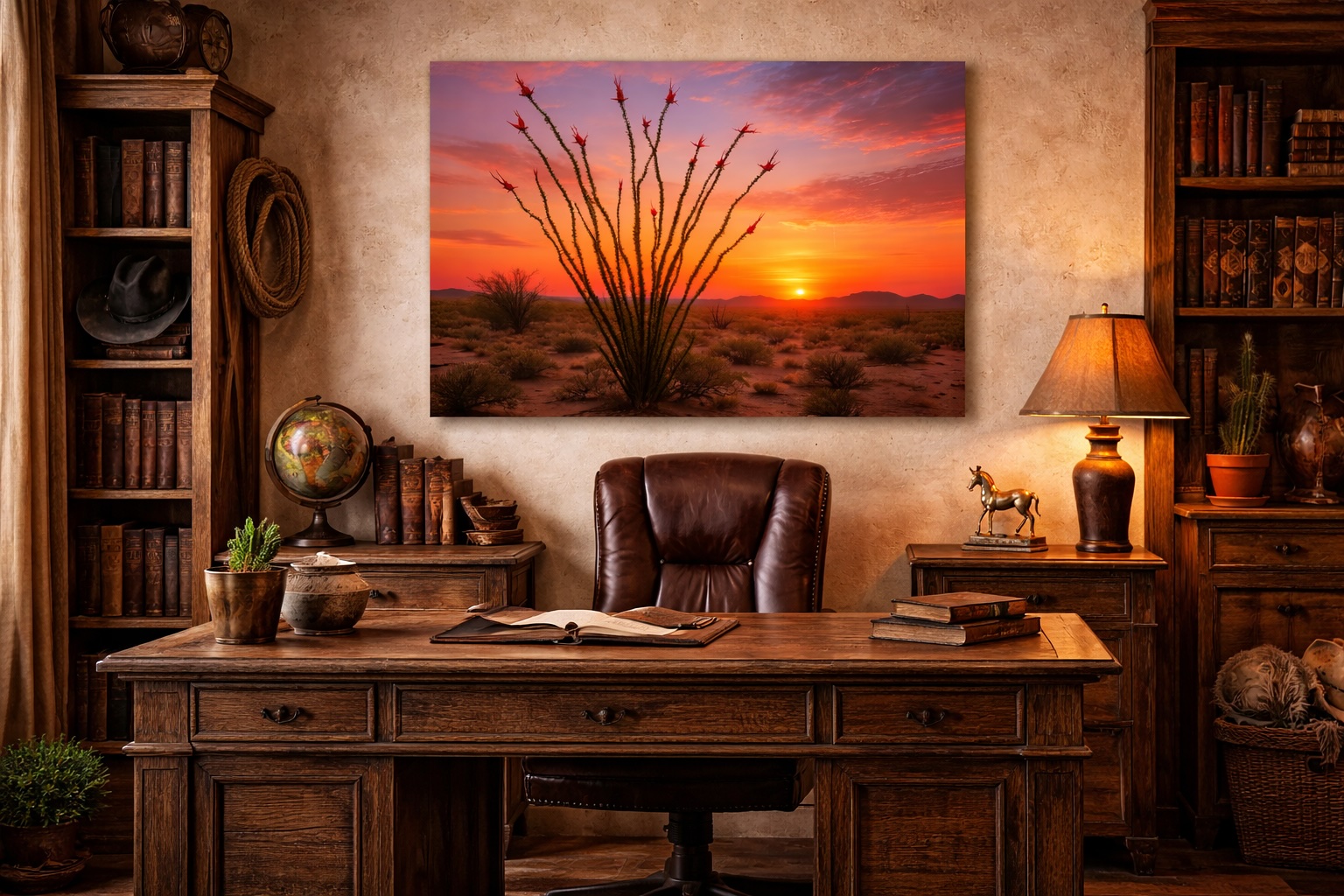 “Ocotillo Sunrise” is part of the Sonoran Art collection, a series of AI-composed fine art landscapes celebrating the Sonoran Desert in painterly impasto oil painting style. Each piece is developed through a collaborative creative process and produced as museum-quality prints on metal, canvas, or fine art paper through Centric Photo in Tucson, Arizona.