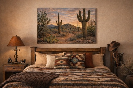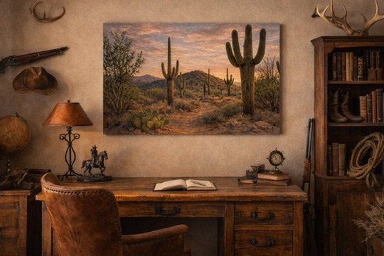 Desert Trail captures that hour. The saguaros anchor the composition with the authority that comes from a century or more of standing in one place, while the trail itself draws the eye forward through the scene and into the open desert beyond. The light is warm and specific — not a generic sunset, but the particular quality of a Sonoran afternoon giving way to evening, the kind that photographers and painters have always found worth chasing in this landscape.