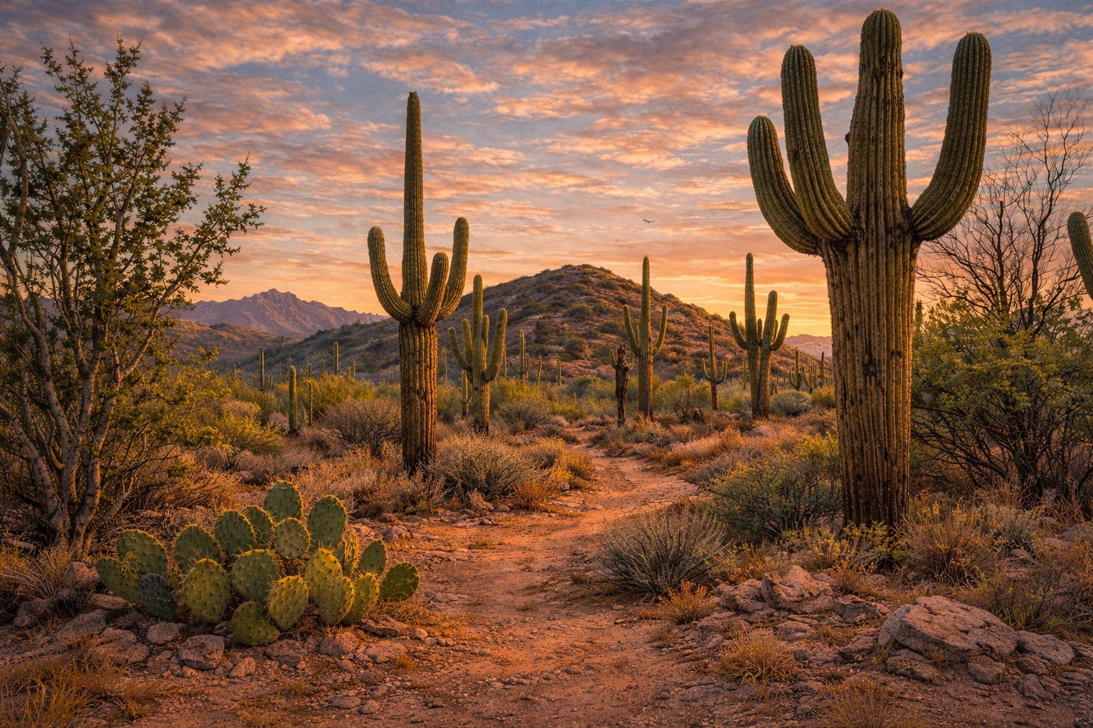 Every desert trail tells you where to look. This one winds through a stand of towering saguaros as the afternoon light turns golden, past prickly pear and palo verde in the particular green they hold at the end of a warm day, toward a sky going gold and peach and deep blue at the horizon. It is an unhurried scene — the kind the Sonoran Desert offers regularly to anyone willing to be out in it at the right hour.