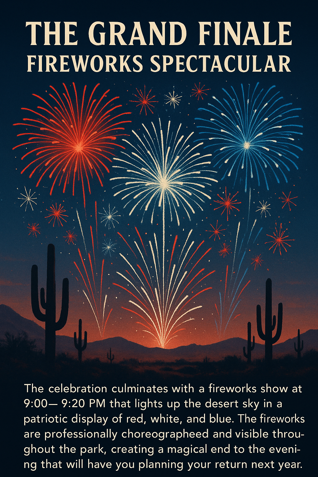 The celebration culminates with a fireworks show at 9:00 – 9:20 PM that lights up the desert sky in a patriotic display of red, white, and blue. The fireworks are professionally choreographed and visible throughout the park, creating a magical end to the evening that will have you planning your return next year.